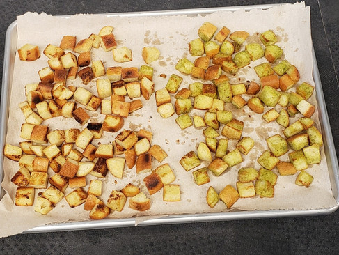 As with most soups it needed a little something extra. Most of us like a little chew when we eat, even with soup. I sliced a baguette into cubes and split it into two bowls. In one bowl, I coated the bread cubes with clarified butter, salt, and pepper. The other bread cubes were tossed in basil, garlic, and olive oil. The end-result was some of the yummiest…. yes, I said yummiest…croutons I have ever tried. The basil croutons by far surpassed the plain buttered ones. The basil and garlic complimented the creamy tomato soup like oregano does with a heavy spaghetti sauce. It gave it that extra little pop of flavor that makes your mouth water anticipating the next bite.