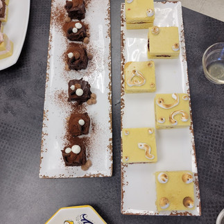 As for the Petits Fours…they were marvelous! We had a guest come in which took away the time we needed to create the poured fondant. This is when it’s rather handy for me to have the baking experience I do. I whipped up a basic American buttercream and flavored it with raspberry preserves. We chose to make naked petits fours and top them with fresh raspberries. They gave the appearance of Neapolitan ice cream. The flavor was a decadent mix of chocolate and vanilla sponge cake and was complimented well by the tart raspberry and smooth, rich buttercream. We dusted some with powdered sugar, and made some without a chocolate layer. We did this to cut our food waste, since we didn't have enough of each dish element to make them all uniform. I think we handled our hiccups well this week and managed to create pleasing dishes both visually and palatably.