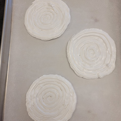 I enjoyed piping the Italian meringue onto the pan to be baked. Something about piping is soothing to me and melts my stress away. We popped them into the oven for roughly 2 hours and pulled them out just in time to use for decorating our Génoise. Thankfully, another group had an extra meringue disk we could use for our base while our meringues were still baking.