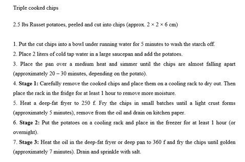 “Triple-cooked chips are a type of chips or deep-fried potato that were developed by English chef Heston Blumenthal. Blumenthal began work upon the recipe in 1993, and eventually developed the three-stage cooking process for their preparation. The preparation process involves the chips first being simmered and then cooled and drained of water using a sous-vide technique or by freezing, deep fried at 130 °C (266 °F) and again cooled, and finally deep fried again at 180 °C (356 °F). The result is what Blumenthal calls ‘chips with a glass-like crust and a soft, fluffy centre’.” (Wikipedia, 2021)