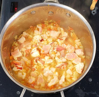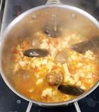 We couldn’t fit our lobster into the pot we chose, so half of him got boiled while the other half stuck out of the pot. We decided it was best to dismantle his body and place the pieces into the pot. This was done to solidify the meat just enough to be able to remove it from the shell and add it to the bouillabaisse. Once the trauma to the lobster was over, the rest of the dish came together smoothly. We bloomed saffron to allow its aromatic presence to really take hold in the bouillabaisse. We also kept our lobster shell pieces as intact as possible to add color and dynamic to our plate presentation. But you'll have to wait just a bit longer for that masterpiece. 😉 I got some great progression photos of the bouillabaisse. Check it out.