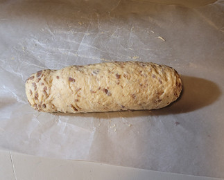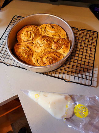 Evaluation: I wanted to turn the sweet roll dough into cinnamon rolls. I used all-purpose flour in place of the bread flour, and I substituted all-purpose flour and a half tablespoon of cornstarch for the cake flour. When making the dough, I must have over-worked it. The dough didn’t want to roll out flat like it needs to. It was extremely tight and very elastic. “Tight gluten is the most common cause of dough that’s difficult to stretch. When gluten is tight, it’s very elastic so it springs back easily. Get your dough to room temperature before you work with it and let it relax for 15 minutes if it feels too tight. Relaxed gluten is easier to stretch.” (Harley, 2022) The brown flakes are a butter, cinnamon, and nutmeg mixture. I melted down the butter and mixed in the spices. After refrigerating the butter mixture to let it harden, I broke it into pieces and combined it with the dough. Once they were out of the oven I made a cream cheese frosting and piped it over the top of the rolls.