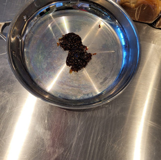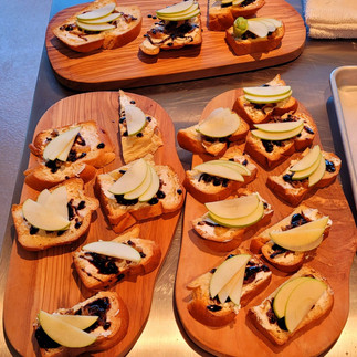 I decided to go with Tapenade hors d'oeuvres. I wanted to use the goat cheese but left it to Will and Natalie for use so neither of us would have to compromise our dish by only using half. Instead, I built my tapenade using purple Kalamata olives as well as Halkidiki olives (also known as donkey olives due to their size), both Greek in origin. Kalamata olives get their flavor and color from ripening longer on the vine than green olives. Green olives tend to be firmer in texture and have a slightly more bitter taste, whereas reddish-purple and black olives are sweeter. I combined the pureed olives with minced garlic, honey, and fresh lemon juice and made a well-balanced tapenade if I do say so myself. I really needed to add capers, but we didn’t have any in the lab. I toasted slices of brioche in the oven and put a heavy schmear of melted cream cheese across the top of each slice. I then added the tapenade and garnished with half a Halkidiki olive and plated on a wood block.
