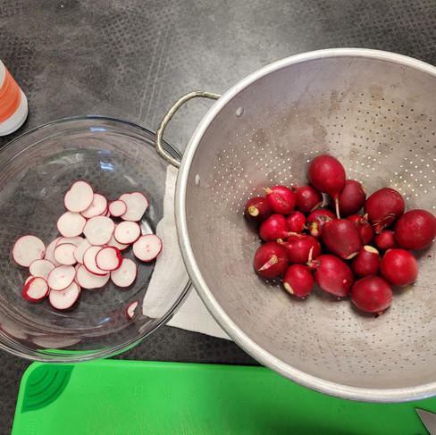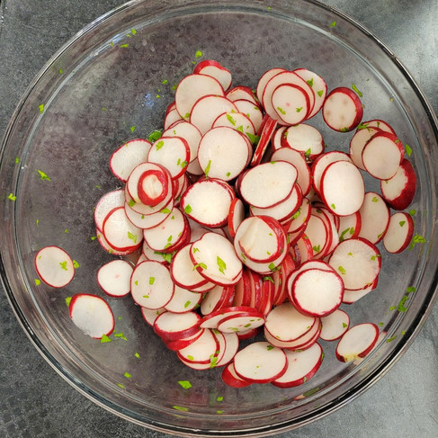 I also pickled some radishes with apple cider vinegar, fresh cilantro, kosher salt, white pepper, and ground ginger. They were a nice compliment to the salad chef created.