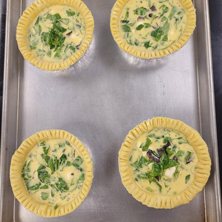 Conclusions: “Egg: This makes the dough more pliable and easy to roll out. Eggs also make the crust more compact.” (Christensen, 2008) I think our egg mishap helped our crust a little. We planned on blind baking the crust for a few minutes to make sure the bottom of the dough cooked through all the way after adding the quiche filling. I think adding the egg may have helped speed up that cooking process a little by adding extra steam in the dough. We filled 4 mini pie pans with eggs, mushrooms, spinach, milk cream, salt, pepper, and goat cheese. Since we made mini quiches instead of one full size quiche, we had concern for the crust getting overdone before the egg mixture could cook through. We baked them for about 30 minutes total, and they came out perfectly. The crust was nice and flaky, and the filling was light and fluffy. The goat cheese gave a nice acidic quality to the rich and savory filling and balanced the earthiness of the spinach and mushrooms.